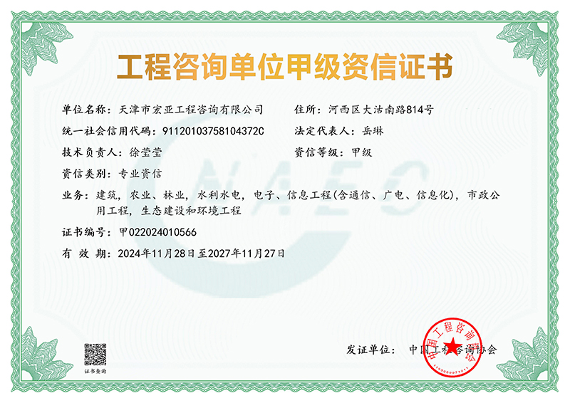 根據中國工程咨詢協會2024年第17號公告,天津咨詢所屬宏亞咨詢公司成功獲得建筑,農業、林業,水利水電,電子、信息工程(含通信、廣電、信息化),市政公用工程,生態建設和環境工程等6個專業甲級資信,并成功升級為甲級綜合資信。