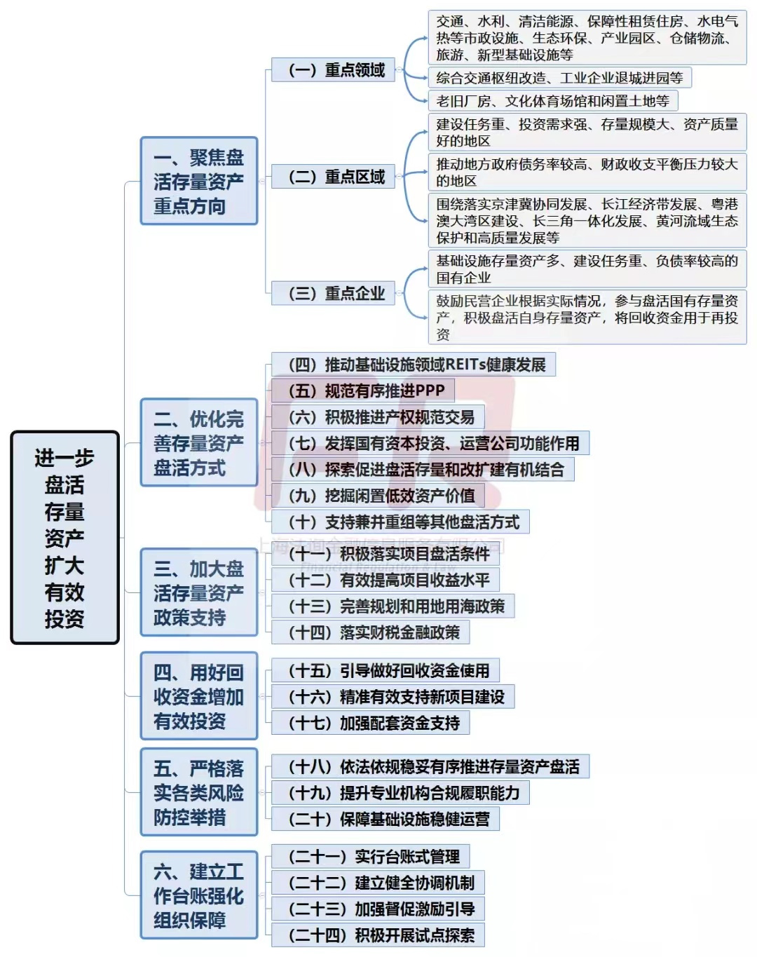 剛剛,國務(wù)院辦公廳發(fā)布《關(guān)于進(jìn)一步盤活存量資產(chǎn)擴大有效投資的意見》(國辦發(fā)〔2022〕19號)。新規(guī)共提出24條意見,整體框架如下: